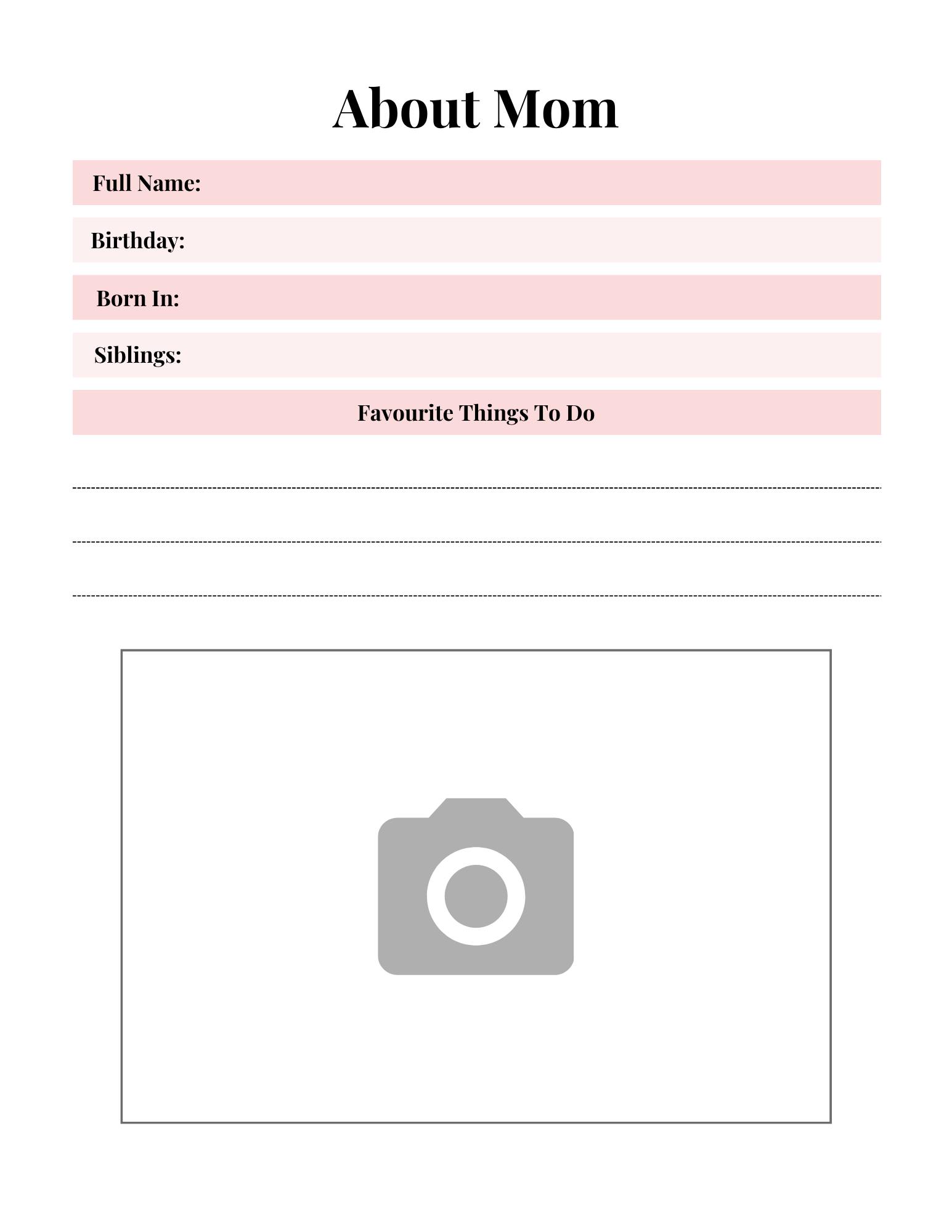 - Mother's Day - 3 photo spaces, date, age, how you celebrated, memorable moments
